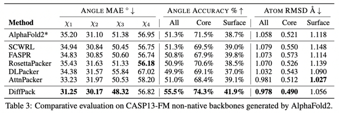 由于 AlphaFold2 等计算结构生物学技术的发展,当前人们的关注重心逐渐转移到非天然主链结构的应用上。因此研究人员将 DiffPack 进一步应用到有 AlphaFold2 生成的非天然主链结构,表 3 给出了包括 AlphaFold2 自身的侧链预测算法在内的不同算法在非天然主链结构测试集上的定量结果。DiffPack 在大多数指标上实现了最先进的水平,这说明了 DiffPack 可以进一步优化 AlphaFold2 预测的潜力。