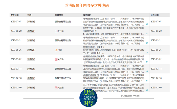 事实上,这不是鸿博股份年内第一次收到关注函。Wind数据显示,公司年内受到深交所多次关注函和问询(见下表)。