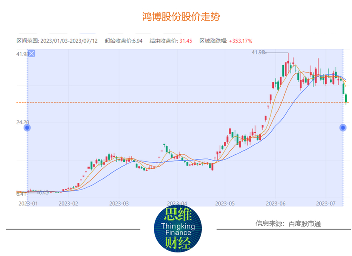 数据显示,与今年年初首个交易日的收盘价6.94元相比,鸿博股份年内的股价一度冲高至41.98元,涨幅高达531.28%,即便近几日有所回落,截至7月12日收盘,鸿博股份股价报收31.45元,年内涨幅仍然高达353.17%(见下图)。