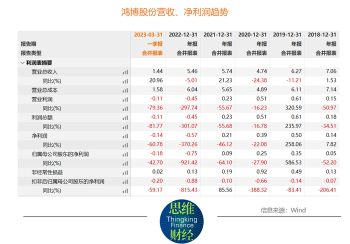 然而近年来,鸿博股份的业绩一直较为低迷,营收净利持续下滑,甚至在2022年和今年一季度出现了亏损的情况。