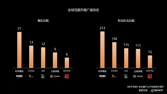 据国内电竞媒体《电子竞技》统计的数据显示,在各类电竞项目中,和平精英以21个赛区数量稳居第一。在活跃队伍数量方面,和平精英的战队更是高达231个。