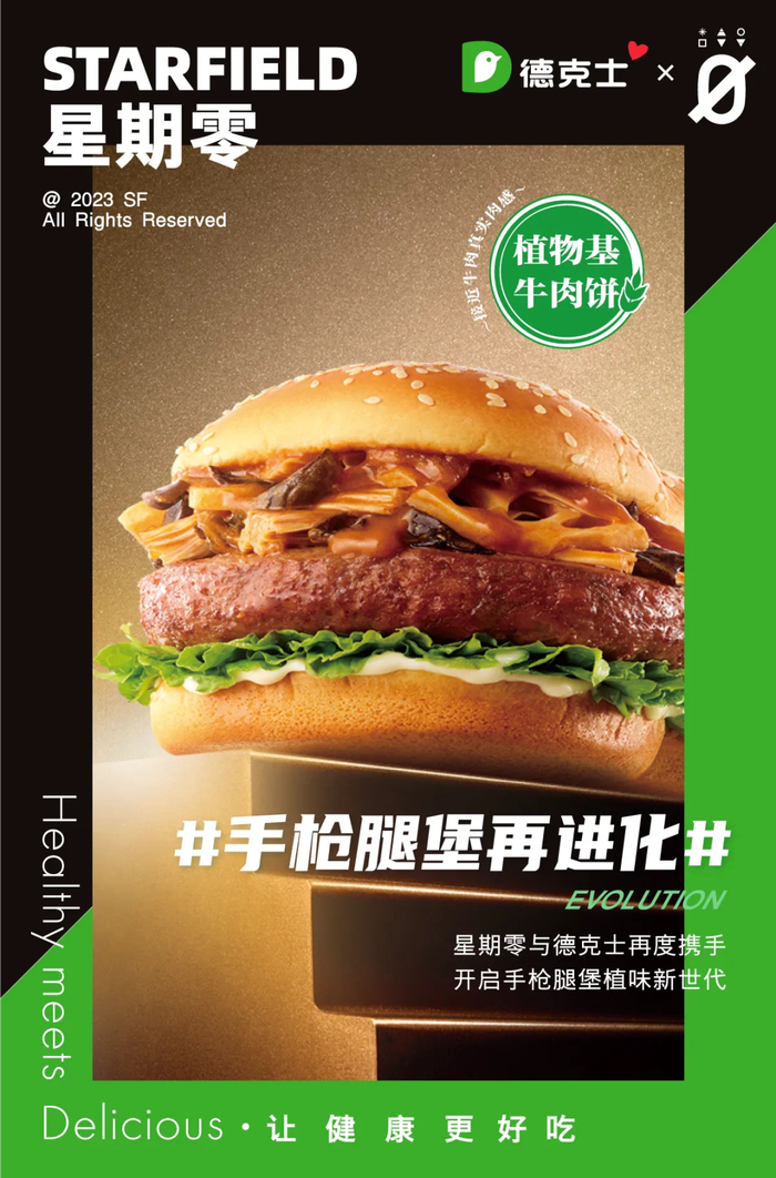 2020年,「星期零」首次携手德克士推出植物肉汉堡绿仙仙植物鸡肉堡,并在德克士全国 2600 家门店上线,上市5天就卖出了超过10万份。