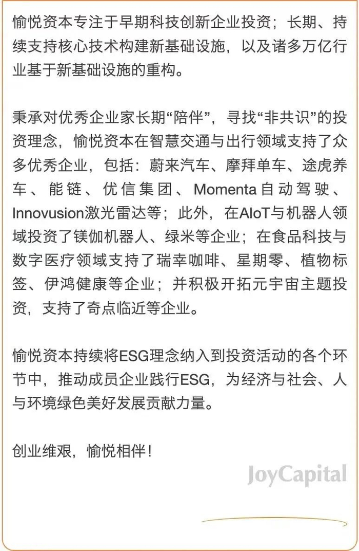未来,愉悦资本将继续把ESG理念纳入到投资活动的各个环节中,更好地支持环境友好型、社会责任履行型、良好治理结构导向型的创业与创新公司,为经济与社会、人与环境绿色美好发展贡献力量。