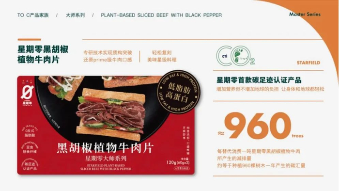 为响应双碳号召,「星期零」还推出了首款碳足迹标签产品——星期零黑胡椒植物牛肉片。这款产品以大豆蛋白为核心原料,每100克富含19.8克的蛋白质,另外还具有高膳食纤维、低脂肪、含益生元、不添加亚硝酸钠、不添加防腐剂等特点,把双碳的宏大叙事与日常美食完美结合在一起。