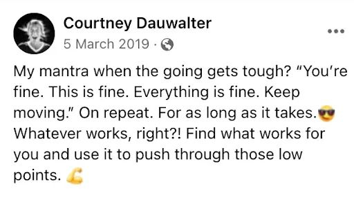 在接受《跑步者世界》的采访时,Courtney 透露了她在遇到困难时会重复一个口头禅:“没关系,没关系,你做得很好,现在这样挺好的。”