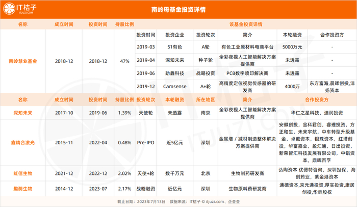 由南岭母基金控股的「南岭慧业基金」至今投资的 4 家企业也均为高科技企业,例如 2019 年 6 月年战略投资 PCB 数字喷印解决商「劲鑫科技」,2019 年 12 月联合东方富海、晨晖创投、沣扬资本投资高精度定位视觉传感器的研发商「Camsense」。