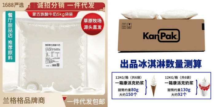 在1688平台上,笔者找到了与茉酸奶出自同一供应商的产品,其中酸奶售价为95元/5kg,冰淇淋奶浆价格为155.25元/12kg。(注:茉酸奶官方声明表示其酸奶原料来自内蒙古兰格格乳业,冰淇淋原奶来自星洲康派克)
