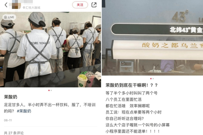 其次,茉酸奶店内人员配置过多但缺乏效率,部分30㎡的标准店也设置了6-8名员工,但据消费者反映出品速度依然很慢。