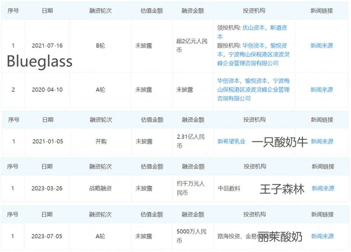 2021年,Blueglass获得超两亿元的B轮融资,新乳业以2.31亿元的价格收购了一只酸奶牛,即使是在新消费融资沉寂的2023年,也先后有王子森林、丽茉酸奶获得融资。