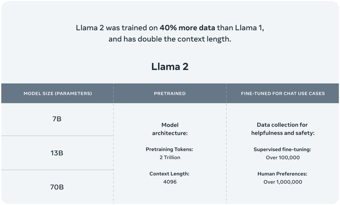 此次 Meta 发布的 Llama 2 模型系列包含 70 亿、130 亿和 700 亿三种参数变体。此外还训练了 340 亿参数变体,但并没有发布,只在技术报告中提到了。