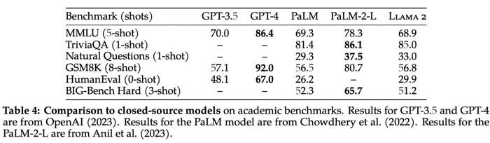 此外,在几乎所有基准上,Llama 2 70B 的结果均与谷歌 PaLM (540B) 持平或表现更好,不过与 GPT-4 和 PaLM-2-L 的性能仍存在较大差距。