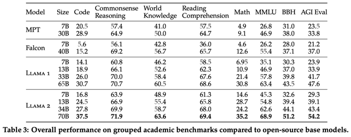 Meta 报告了 Llama 1、Llama 2 基础模型、MPT(MosaicML)和 Falcon 等开源模型在标准学术基准上的结果。