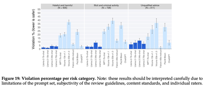 下图 19 显示了不同 LLM 在不同类别中安全违规百分比。