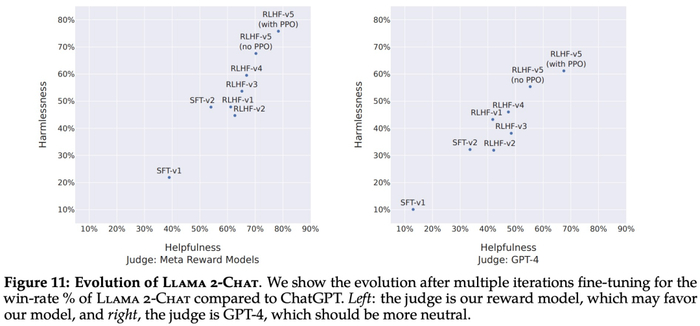 随着收到更多批次的人类偏好数据注释,能够训练出更好的奖励模型并收集更多的提示。因此,Meta 训练了连续版本的 RLHF 模型,在此称为 RLHF-V1、...... , RLHF-V5。