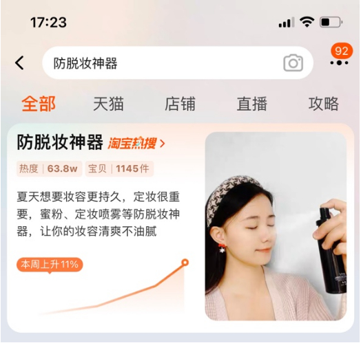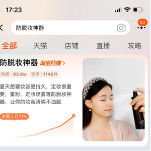 近期,“防脱妆神器”冲上淘宝热搜。淘宝上,近一个月“防水化妆品”搜索量翻番,定妆喷雾销量上涨超100%。
