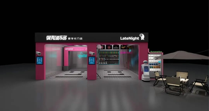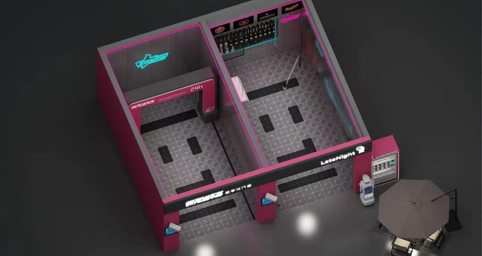 深夜洗车房最新推出的深夜mini门店模型,装修风格是红黑色调的潮流宇宙风,门店内有两个洗车工位,一个是配备半自动洗车设备的快洗工位,另一个是可以拍照打卡的精洗工位,门店还配有负责销售的引导机器人和自动餐饮贩卖机。