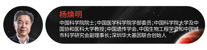 杨焕明,中国科学院院士;中国医学科学院学部委员;中国科学院大学及中国协和医科大学教授;中国遗传学会、中国生物工程学会和中国城市科学研究会副理事长;深圳华大基因联合创始人。杨焕明多年从事基因组学的科研和教学工作,他和他的华大团队及全球合作者一起完成了 “国际人类基因组计划(HGP,1999-2003)”、“国际人类单体型图计划(HapMap,2002-2006)”、“国际千人基因组计划(G1K,2008-2012)”、 “国际癌症基因组计划(ICGP,2008-2010)”和“国际酵母基因组重新设计和合成计划(Sc2.0,2011-2017)”等国际合作计划,以及水稻、家猪、家鸡、家蚕、熊猫以及 SARS 病毒等多项动植物、微生物的基因组计划。杨焕明在国际学术杂志上发表论文 600 余篇,其中 120 余篇发表于 Cell、Science、Nature 及其子刊等杂志上。杨焕明还是欧洲分子生物学组织、发展中国家科学院和非洲科学院成员,及丹麦、德国、印度、乌克兰、美国等国家科学院的国际/外籍院士。
