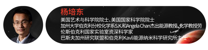 杨培东,美国艺术与科学院院士、美国国家科学院院士,加州大学伯克利分校化学系 S.K. 和 Angela Chan 杰出能源教授和化学教授,劳伦斯伯克利国家实验室资深科学家,巴斯夫加州研究联盟和伯克利 Kavli 能源纳米科学研究所主任,其以半导体纳米线及其在光子和能量应用方面的研究著称。1993 年杨培东获得中国科技大学应用化学学士学位,1997 年获得哈佛大学化学博士学位,之后进入加州大学圣芭芭拉分校进行博士后研究,随后任教于加州大学伯克利分校。他曾获得全球能源奖、麦克阿瑟天才奖、美国能源部劳伦斯奖、美国化学会纳米科学奖、美国材料学会奖章、贝克兰奖章、阿尔弗雷德·斯隆研究学者奖、贝克曼青年学者奖、美国自然科学基金青年学者奖、美国材料学会青年学者奖、裘利斯·史普林格应用物理奖、美国化学会化学奖和艾伦·沃特曼奖。2014 年获汤森路透物理引文桂冠奖。
