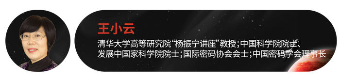 王小云,清华大学高等研究院“杨振宁讲座”教授,中国科学院院士,发展中国家科学院院士,国际密码协会会士,中国密码学会理事长。主要从事密码理论及相关数学问题研究。提出了密码哈希函数的碰撞攻击理论,破解了包括 MD5、SHA-1 在内的 5 个国际通用哈希函数算法;主持设计的哈希函数 SM3 成为 ISO/IEC 国际标准。代表性论文 50 余篇, 3 篇获欧密会、美密会最佳论文。曾获国家科技进步一等奖,国家自然科学二等奖,陈嘉庚科学奖、求是杰出科学家奖,苏步青应用数学奖,未来科学大奖——数学与计算机科学奖等。