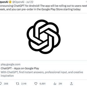 该公司周六(7月22日)在推特上宣布,安卓版ChatGPT将于下周推出,但没有列出具体日期。并且该推文直接链接到了谷歌Play商店的预订页面,用户可以在那里注册,一旦应用程序可用就可以安装它。