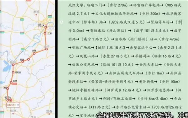 近日,一位小伙在网上火了,花一天半、77.7元钱从武汉坐公交到长沙,这举动也是没sei了。