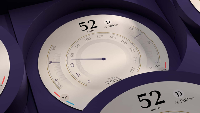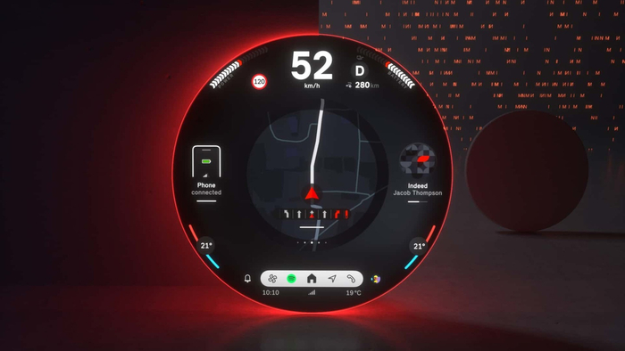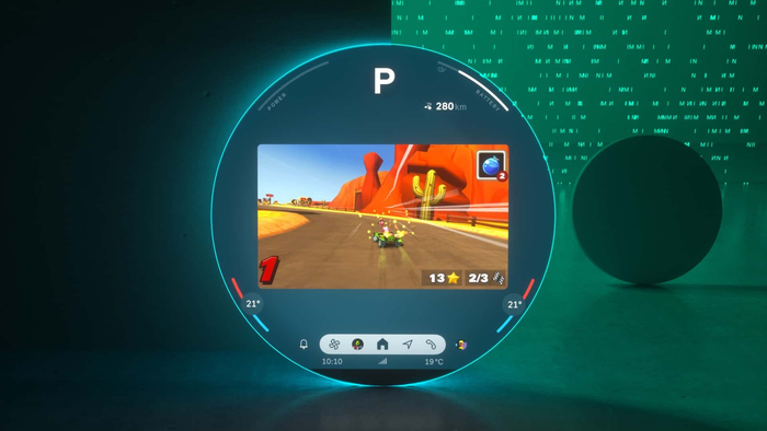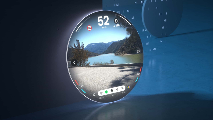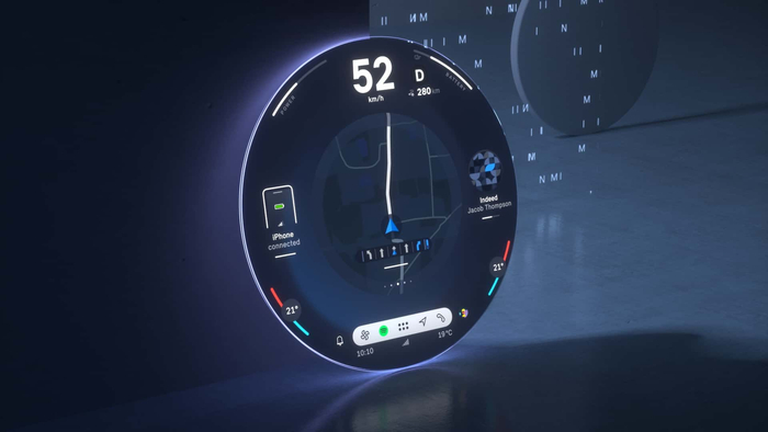 新车取消了传统的仪表盘结构,而是用 HUD 抬头显示取而代之。此外,这块圆形中控屏可提供充电优化路线规划功能,以及 3D 地图、5G 连接和基于 AI 的视图。车机系统提供了三种“体验模式”,分别为 Core,Green 以及 Go-Kart。从官方公布的图片来看,这块中控屏还有大量风格各异的预设主题可选,将主打个性化。