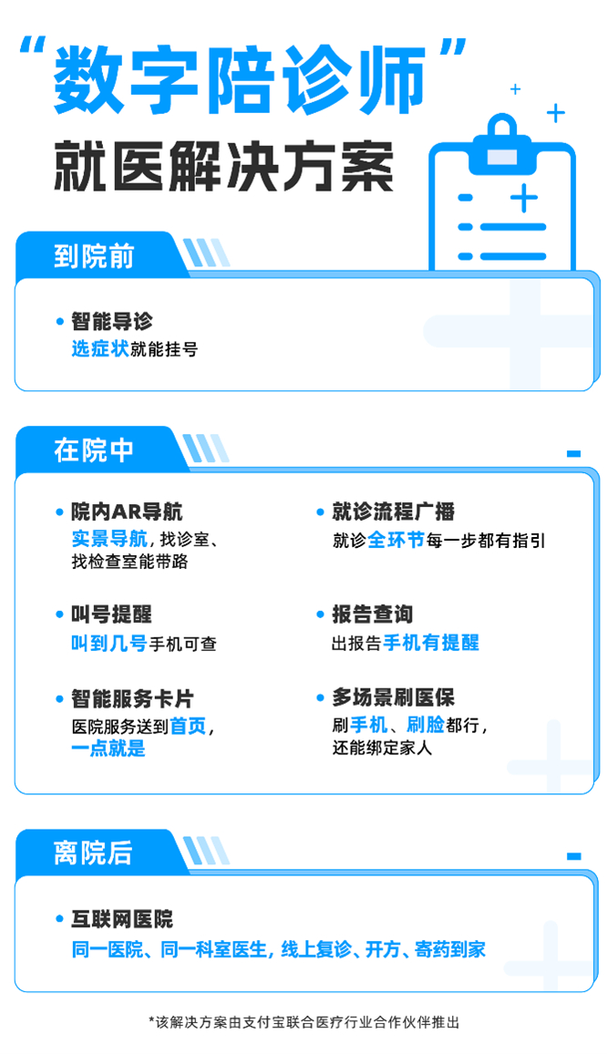 支付宝联合医疗行业合作伙伴推出了全国首个“数字陪诊师”解决方案:就医流程有提示、AR导航找诊室、排队到号手机有提醒,全流程陪伴指引,专治看病“犯迷糊”。