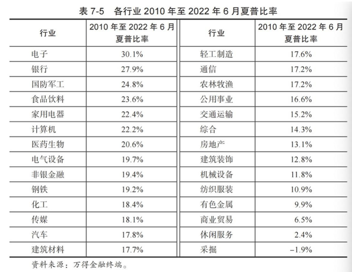 我计算了全部 A 股的夏普比率,时间范围是 2016 年至 2022 年 6月,然后再按照申万行业分类取中位数,得到表 7-4。