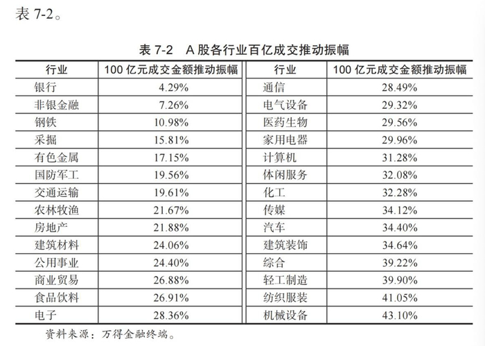 我选取从 2015 年底到 2022 年 6 月这个时间段,计算了 A 股各行业的成交推动振幅,然后再把它们按照申万行业分类取中位数,得到表7-2。