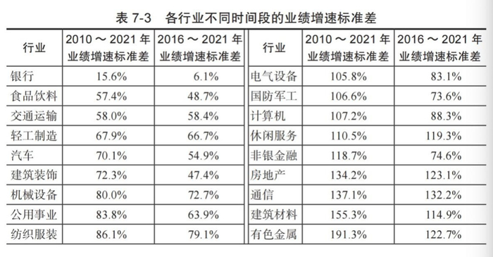 于是我统计了 2016 ~ 2021 年所有 A 股的历年净利润增长率,然后计算了这些数据的标准差。为了加强检验效果,我又把时间范围扩大到 2010 ~ 2021 年,再次计算了相应的结果。最后按照申万行业分类取中位数,得到的结果如表 7-3 所示。
