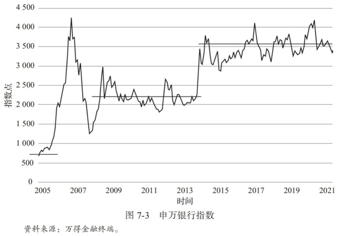 在经典的金融理论中,股票价格总是被假设为随机漫步。如果我们观察一些银行股的长期走势,比如月 K 线,很容易发现它们明显不是随机漫步,而是具有一定规律的。我们这里给出了申万银行指数图, 如图 7-3 所示,它的价格非常具有代表性。其他银行股个股的走势,读者可以自行查看。