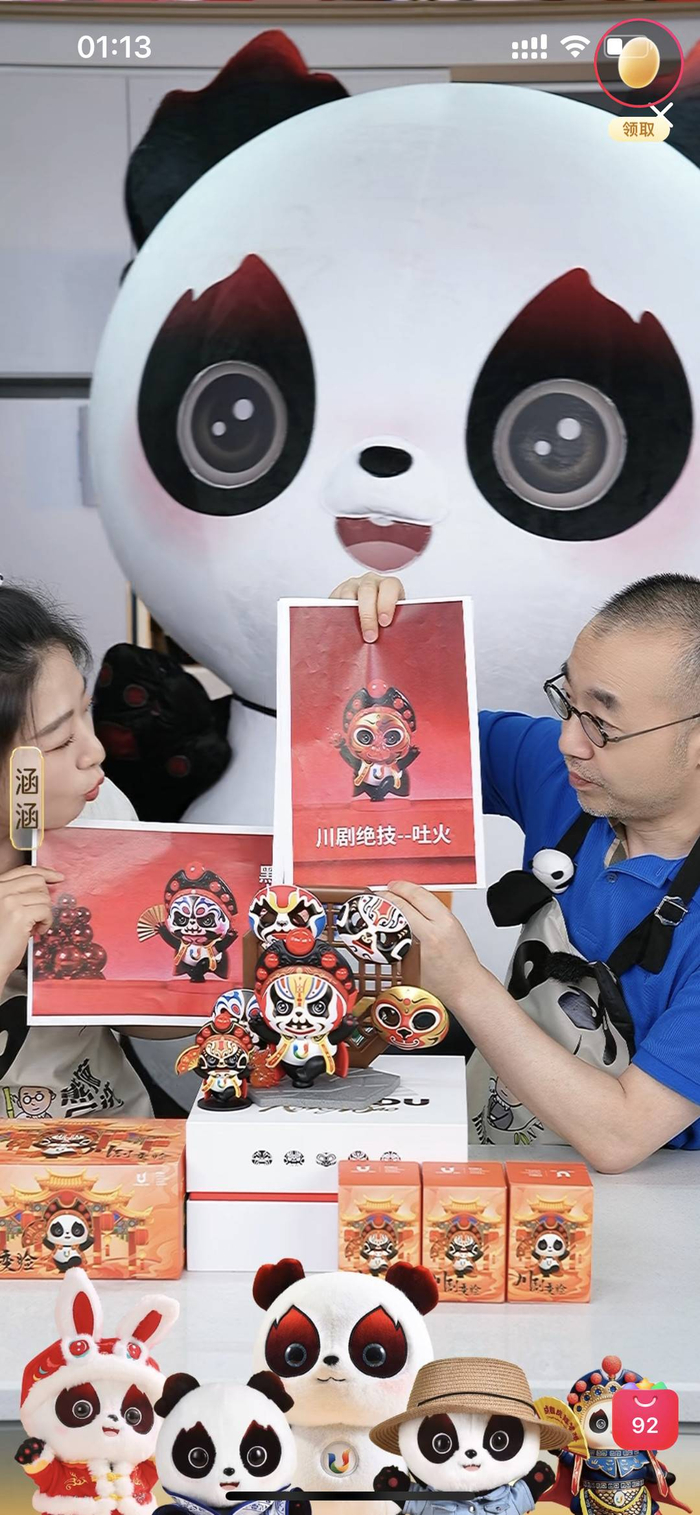 “在大运会开幕当晚,我们‘刘仪伟-熊猫会选’在成都-金融城双子塔下、特许商品店旁搭建直播间上架‘蓉宝’,几分钟就销出上万单,金融城双子塔的灯光秀和蓉宝周边不停地吸引来往的人群观看。当晚,蓉宝川剧变脸盲盒是线上卖得最好的周边产品,因为最具有四川地域特色。”刘仪伟直播间相关负责人介绍。