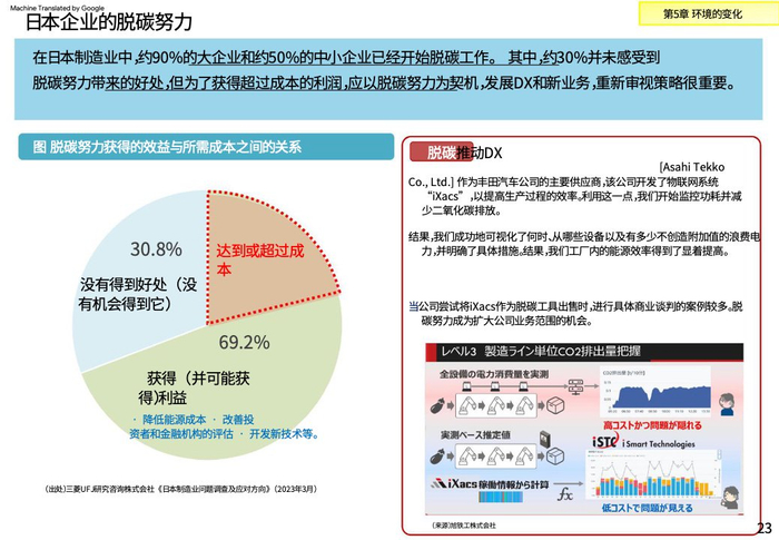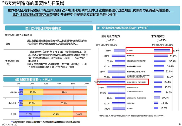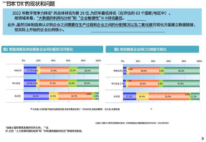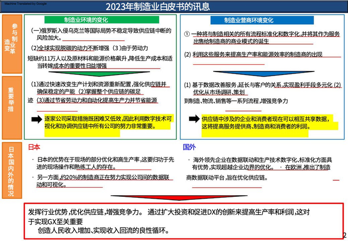 从日本2023年《制造业白皮书》中,我们看到了全球制造业发展的新趋势,即“在有效利用既有优势的同时,优化供应链,增强竞争力”“通过扩大对数字转型(DX)的投资和推动创新,提高生产率、增加利润,创造良性循环,对实现绿色转型(GX)至关重要”。白皮书强调,鉴于目前国际形势不稳、去碳化和劳动力短缺等因素带来的供应链中断风险加大,将加快基础技术和前沿技术的布局,并提出“增强供应链韧性来确保产能稳定”“实现全供应链的碳足迹可视化”“通过节省劳动力和自动化提高生产率和实现节能”“通过数字技术,实现全供应链的可视化和共同协作”等重要举措。上述举措是日本制造业的未来动向,但也具有一定代表性,数字化、脱碳、供应链安全等是今后全球制造业都将关注的问题。