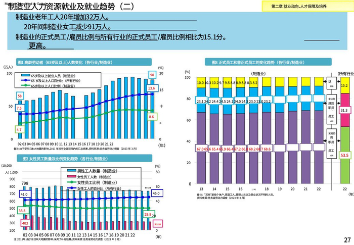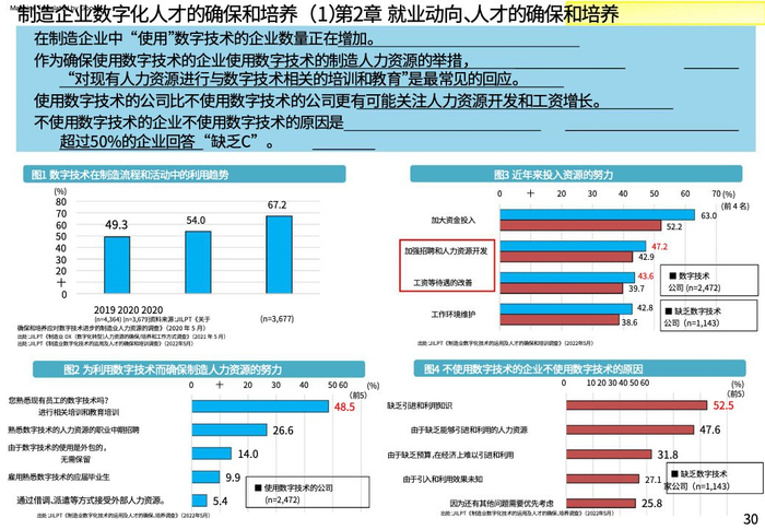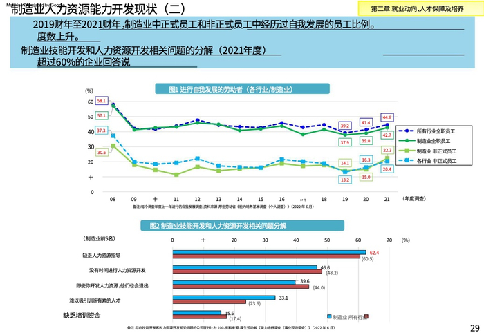 对于未来日本国内生产基地与海外基地的角色分工,无论是大企业还是中小企业,将日本国内生产基地视为创造新技术和新产品基地的占比最大。此外,在维持/ 扩大国内生产基地时,约60%的制造商将“确保工厂工人”或“确保高级技术人员和熟练技能人员”作为希望日本政府改善的环境因素,称劳动力短缺是一个挑战。