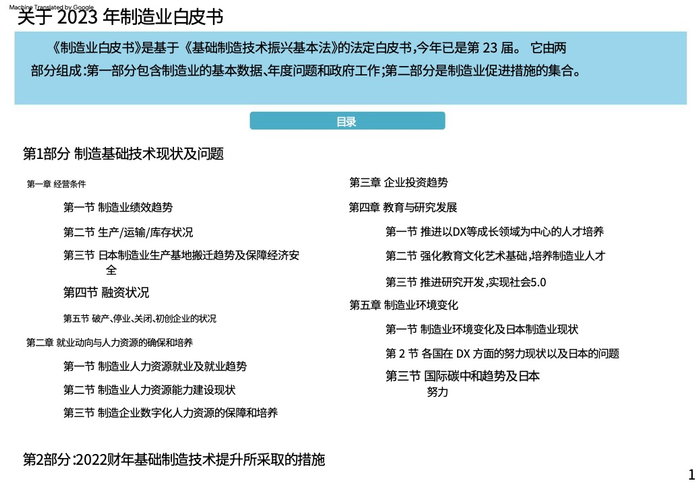 2023年6月2日,日本发布2023年版《制造业白皮书》。这是自2002年以来,日本政府发布的第23份白皮书,该白皮书由日本经济产业省、厚生劳动省和文部科学省共同撰写。白皮书共分为两大部分,第一部分描述日本制造业的现状和挑战;第二部分描述日本政府在过去一年推动制造业发展的主要措施。本文将关注 2023年版《制造业白皮书》中有关全球制造业新趋势变化的情况,以及日本在这一新趋势下将采取的行动。2023年版《制造业白皮书》分析了日本、中国、美国、欧洲和韩国等主要国家(地区)在全球市场中的优势领域,以及在全球市场中的份额,包括具有代表性的最终产品、中间产品和零部件。白皮书表示,“日本政府大力推动制造业基础技术的产业振兴和前沿技术研发”,强调“在有效利用既有优势的同时,优化供应链,增强竞争力”。白皮书以2021年全球市场占有率在60%以上的品种数量为指标,排名依次是日本(220个)、美国(99个)、欧洲(50个)、中国(44个)。