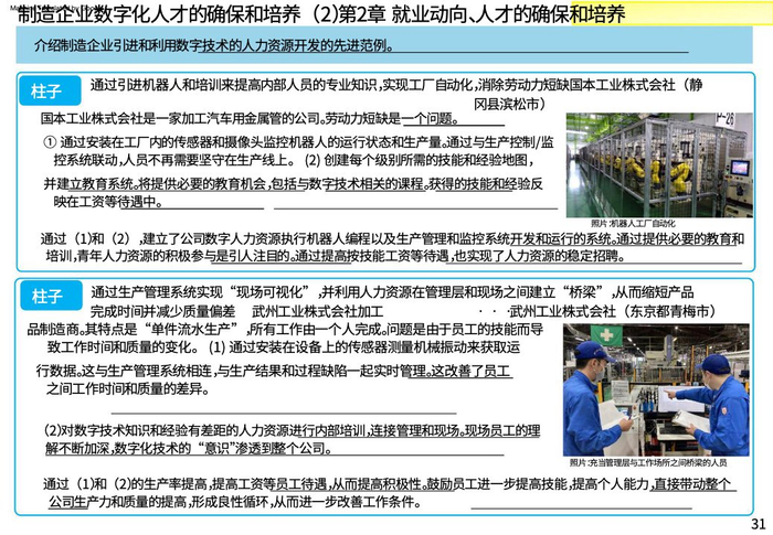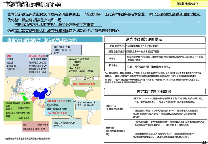 白皮书称,根据世界经济论坛在全球工厂中所选出的“灯塔工厂”(即具有榜样性的尖端制造工厂),截至2023 年1月,共有132家工厂入选。入选工厂的共同点为:通过利用数字技术,跨越企业壁垒,优化整个供应链,从而提高生产率,抓住市场需求开展灵活生产,提高能源效率和减少温室气体排放等。因此,作为制造业先进性的评价因素,不仅重视整体生产效率,还强调实现数字转型(DX)和绿色转型(GX)等“全面优化”能力。从入选工厂总部所在国家的具体情况看,美国位居首位,有18 家企业36个基地入选(包括强生10个基地、宝洁6个基地、西部数据5个基地等);其次是中国大陆,有14 家企业25个基地入选(包括海尔6个基地、美的5个基地等),2023年1月新增“灯塔工厂”中中国大陆有7家工厂入选,分别是工业富联深圳工厂、海尔合肥工厂、上海华谊新材料工厂、联想合肥工厂、亿滋苏州工厂、联合利华天津工厂、纬创资通中山工厂;德国位居全球第三,有8 家企业14个基地入选(包括博世4个基地、汉高3个基地、西门子2个基地等)。 日本仅有2家 企业2个基地 入选(包括日立1个基地和三井海洋开发1个基地)。白皮书分析认为, 日本制造业意识到需要认清全球制造业的新动向,即未来要通过数字转型(DX)和绿色转型(GX)实现整体优化。