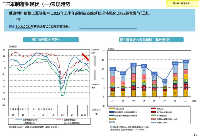 2021 年,制造业约占日本GDP 的20%,仍发挥着支撑日本经济核心产业的作用。根据财务省发布的《企业统计调查》,2021 年日本制造业整体营业利润约为18 万亿日元,为近10 年来最高,2022年制造业整体营业利润约为19 万亿日元,超过上年。