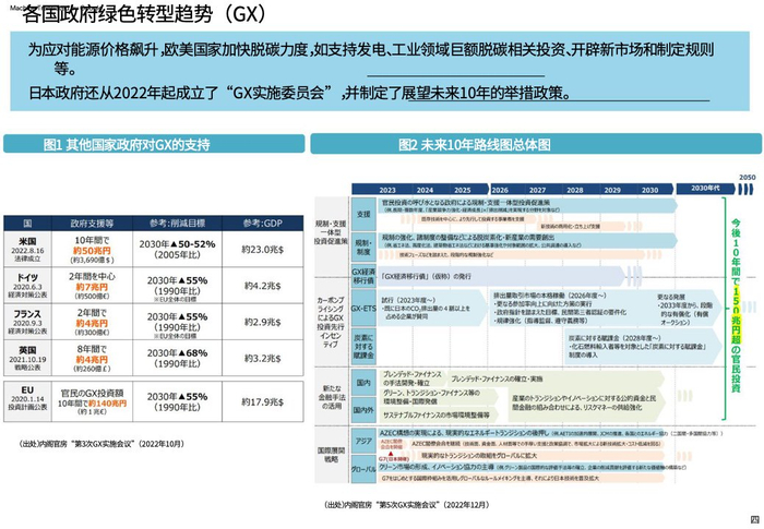 自2022 年2月俄乌冲突爆发后,全球能源价格暴涨。欧盟制定了在10 年内通过官民合作实现目标约合140万亿日元投资的支持政策。美国除了出台《基础设施投资法案》外,还在2022 年8月发布10 年间计划投资约合50万亿日元的《通胀削减法案》,制定了举全国之力促进脱碳投资的支持政策。