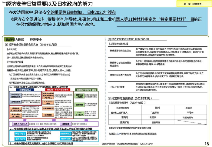 白皮书认为,在国际上,随着确保半导体等战略性物资和关键技术的重要性增加,各国都在加强确保经济安全的措施,这也成为日本的重要课题。2022年5 月,日本参议院全体会议表决通过《经济安全保障促进法案》。2022 年12月,日本政府将抗菌药、肥料、永磁体、机床和工业机器人、半导体、蓄电池等11类指定为特定重要商品。 针对11类“特定重要商品”,日本逐一制定了“确保稳定供应的指导方针” ,正在通过对私营企业的支持,推进确保稳定供应的工作。