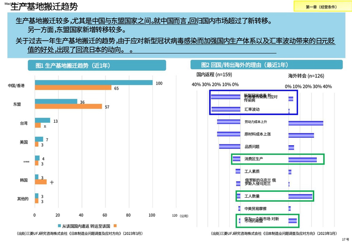 从日本制造业企业近期转移生产基地的调查结果看,最近一年进行生产基地转移(国内回归、海外转移)的企业中,从中国回归日本本土的企业最多(从中国回归日本本土的企业有113家,向中国转移的日本企业有70家)。此外,向东盟国家新增海外转移数量超过回归日本本土的数量(从东盟国家回归日本本土的企业为36家,向东盟国家转移企业为57家)。