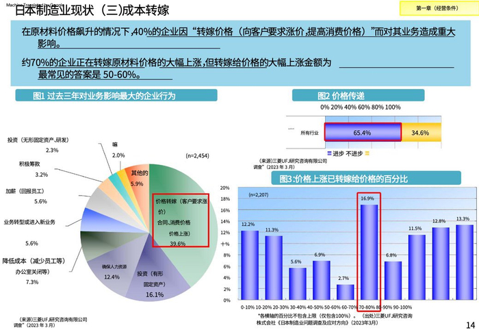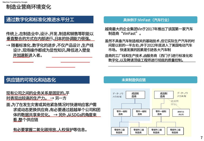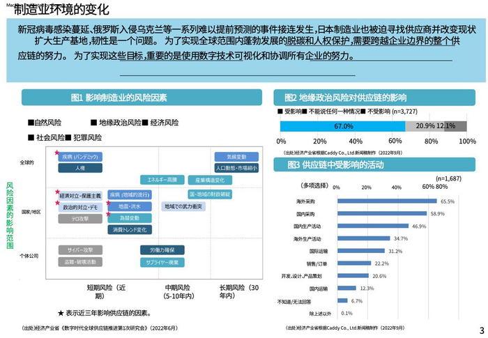 白皮书还强调,由于俄乌冲突,国际原材料和能源价格飙升、汇率波动等因素对2022年日本制造业企业的影响最大。鉴于目前国际形势不稳、去碳化和劳动力短缺等因素带来的制造业供应链中断风险加大,将加快基础技术和前沿技术的布局,并提出“增强供应链韧性来确保产能稳定”“实现全供应链的碳足迹可视化”“通过节省劳动力和自动化提高生产率和实现节能”“通过数字技术,实现全供应链的可视化和共同协作”“大力推动创新型人工智能、大数据、物联网、材料、光学/量子技术、环境能源等对未来社会至关重要的关键前沿技术的研发”等方面措施建议,从而提升日本制造业的竞争力。