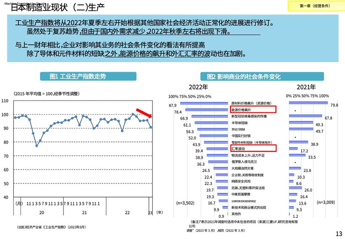 影响日本制造业营商环境的变化因素包括:2021 年新冠疫情蔓延,半导体、零部件和材料的短缺 ,2022年原材料和能源价格飙升,俄乌冲突等。从制造商对上述变化因素及其对企业影响的调查来看 ,约90% 的受访者认为是“原材料(资源)价格上涨”,约80% 认为是“能源价格上涨”。根据2021 年的调查结果,约一半的受访者认为是“原材料价格(资源价格)上涨”“新冠疫情蔓延”“劳动力短缺”和“半导体短缺”四项。根据2022 年的调查结果,约一半的受访者认为是“原材料价格(资源价格)上涨”“新冠疫情蔓延”“半导体短缺”“劳动力短缺”等六项。此外,与2021 年相比,2022年选择“汇率波动”的受访者比例增加一倍以上。由此可见,原材料和能源价格飙升、汇率波动等因素对2022 年日本制造业企业的影响最大。