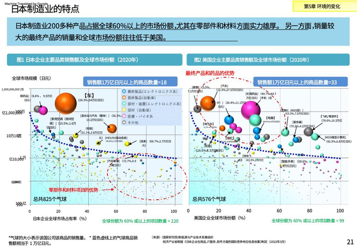 日本制造业的特点:白皮书分析,根据上述数据,日本生产的主要产品数量为825 个,全球市场占有率60%以上的品种数量为220个,销售额超过1万亿日元的产品有18 个。全球份额60% 以上的品种远超美国、欧洲和中国。其中约70% 是电子类和汽车等零部件材料,是日本制造业的强项。销售额超过1 万亿日元的品种与美国、欧洲、中国相比较少,销售额超过10万亿日元的品种只有汽车和混合动力车。白皮书分析称,日本严重依赖汽车产业。日本制造业在零部件材料产品上具有优势,但在销售额较大的终端产品方面,除汽车以外的其他领域,与美国、欧洲和中国相比,销售额和全球份额较小,且品种也较少。