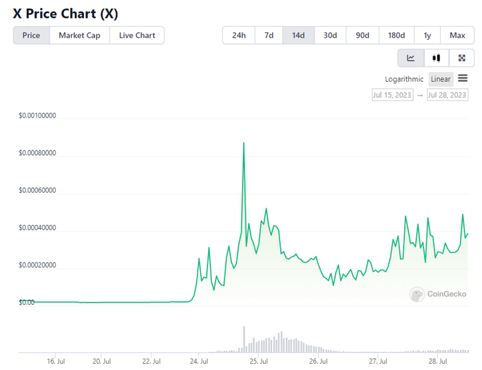 在24号当晚数据最高点时,涨幅一度达到了1961.4%,但紧接着又以同样陡峭的幅度快速跳水,现在稳定在最高点1/4的价格。就算在推特改名风波渐渐平息,X币也被证明和马斯克无关后,各个交易平台依然看好X币近期的表现,它的交易量也维持在了一个相对稳定的水平。