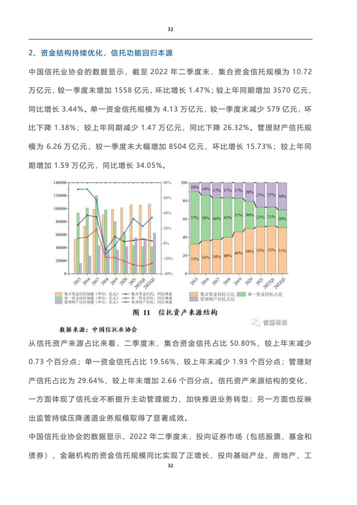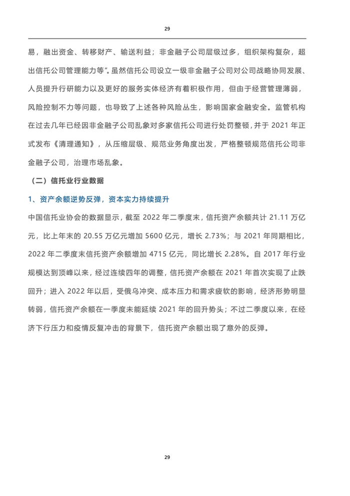 信托资产余额逆势反弹。经过连续四年的调整,信托资产余额在2021年首次实现了止跌回升,虽然在2022年一季度未能延续回升势头,不过二季度以来,在经济下行压力和疫情反复冲击的背景下,信托资产余额出现了意外的反弹,二季度末余额共计21.11万亿元,同比增长2.28%。