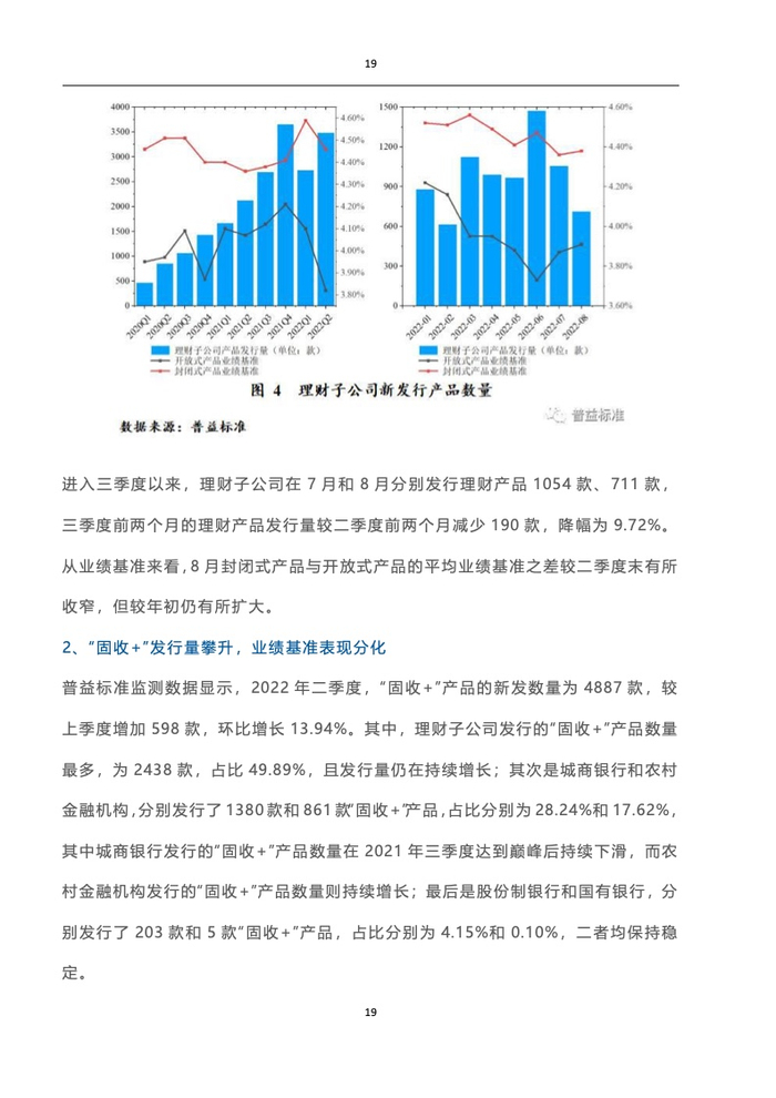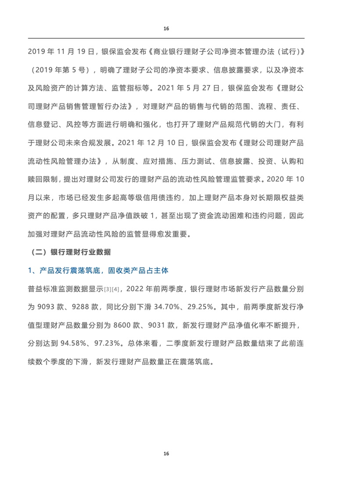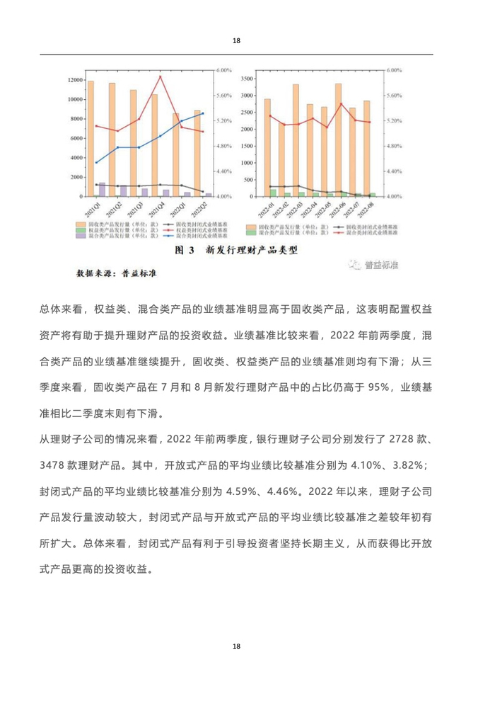 银行理财产品发行震荡筑底。普益标准监测数据显示,2022年前两个季度,银行理财市场新发行产品数量分别为9093款、9288款,同比分别下滑34.70%、29.25%,产品净值化率分别达到94.58%、97.23%。总体来看,二季度新发行理财产品数量结束了此前连续数个季度的下滑。从2022年前两个季度新发行理财产品类型来看,固收类产品在新发行理财产品中的占比分别达到94.19%、95.70%,占据绝对主体。总体来看,权益类、混合类产品的业绩基准明显高于固收类产品。