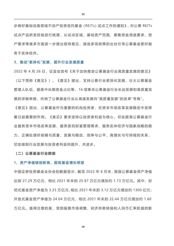 公募基金资产净值续创新高。截至2022年8月末,我国公募基金资产净值达到27.29万亿元,相比2021年末增加约1.73万亿元。其中,封闭式基金资产净值3.25万亿元,较年初增加约1300亿元;开放式基金资产净值24.04万亿元,较年初增加约1.60万亿元。