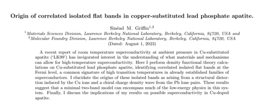 然而,除了复现实验结果外,还有人从理论上支持了LK-99是超导体的可能性。美国劳伦斯伯克利国家实验室的研究院在arXiv发表了一篇论文宣称在LK-99上发现了费米能级的孤立平带——具体原理过于复杂就不解释了,只需要知道他是超导晶体所具有的特性标志就行。
