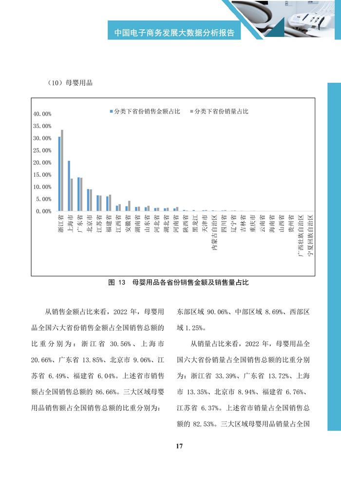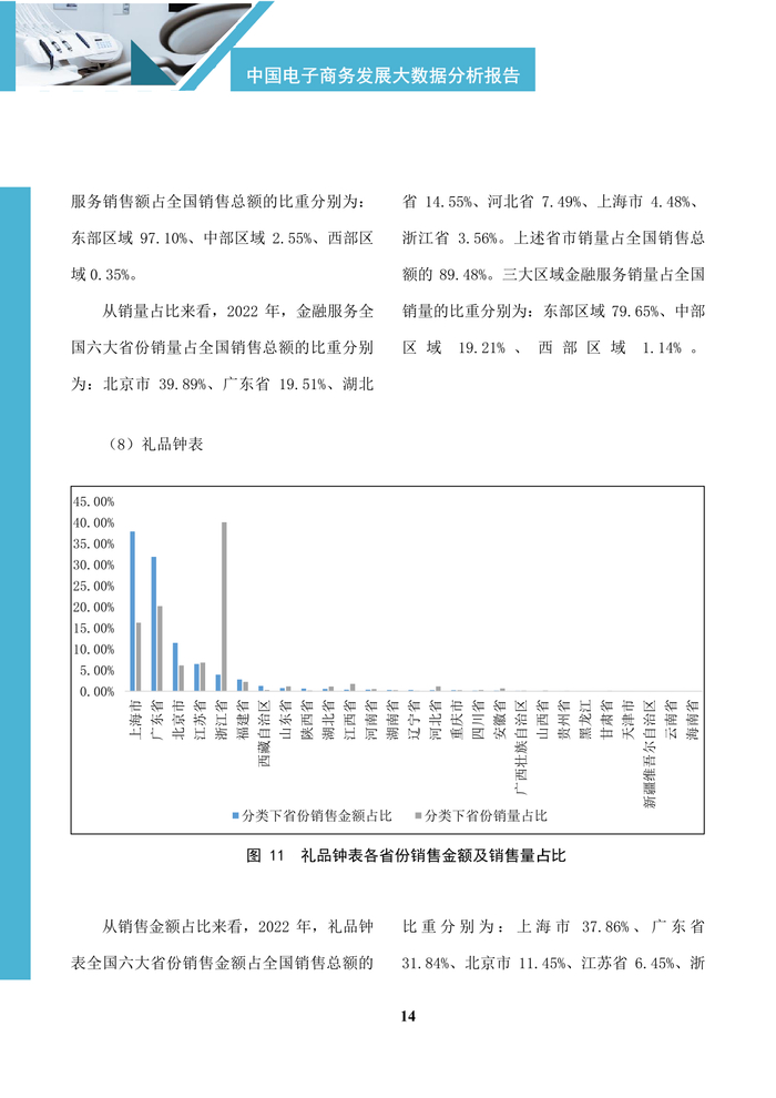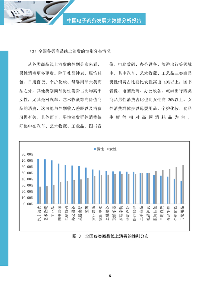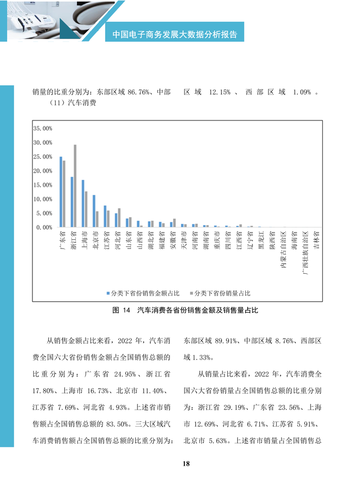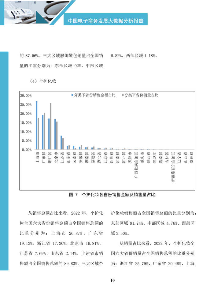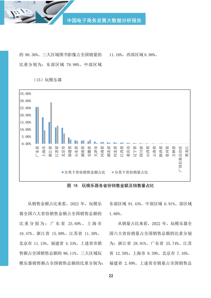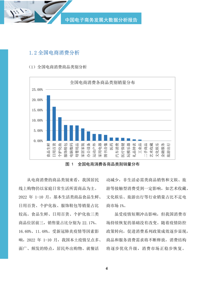 本数据分析报告的主要结论有以下几点。第一,从电商销售来看,2022年1-10月,全国电商销售金额同比上升4.15%,销量同比下降2.96%。第二,从电商消费来看,全国电商消费以家庭日常生活所需商品为主,31-40岁年龄段是消费主力军,男性群体消费更多更贵。第三,从各类商品电商销售的地理分布来看,18类商品的电商销售都具有较高的地理集聚性,其中13类商品的销售前六强省份的销售额占比(CR6)超过85%,地理集聚度最高的商品类别是金融服务类,前六大省份占比超过97%,最低的商品类别是食品生鲜类,前六大省份占比约为71%;广东、北京、上海进入了17类商品的电商销售前六强省份,浙江、江苏进入了16类商品的电商销售前六强省份。第四,从电商发展的区域格局来看,我国电商发展具有较高的空间集聚性,我国电商发展的区域格局呈现“东强西弱”态势,广东省、北京市、浙江省、上海市、江苏省、福建省是全国电商发展的第一梯队,电子商务价格指数排名前三的城市分别是上海市、杭州市和北京市。
