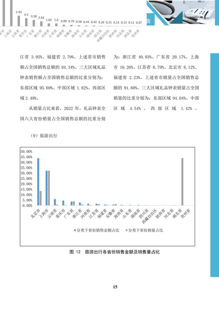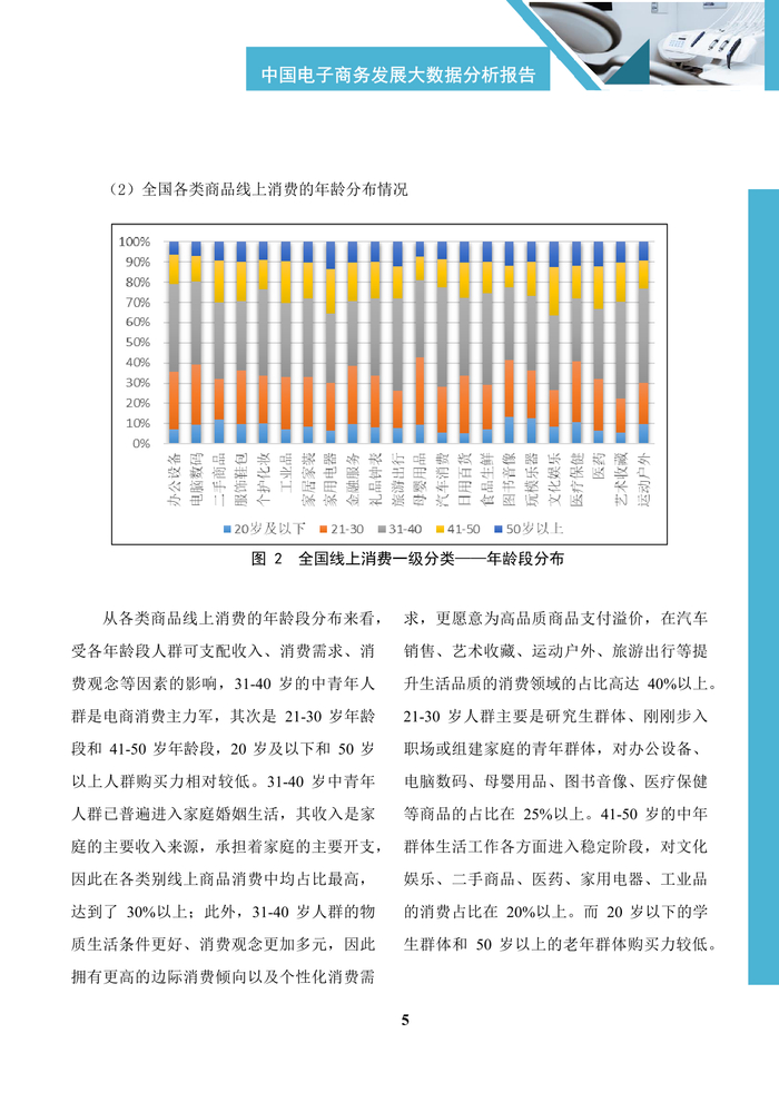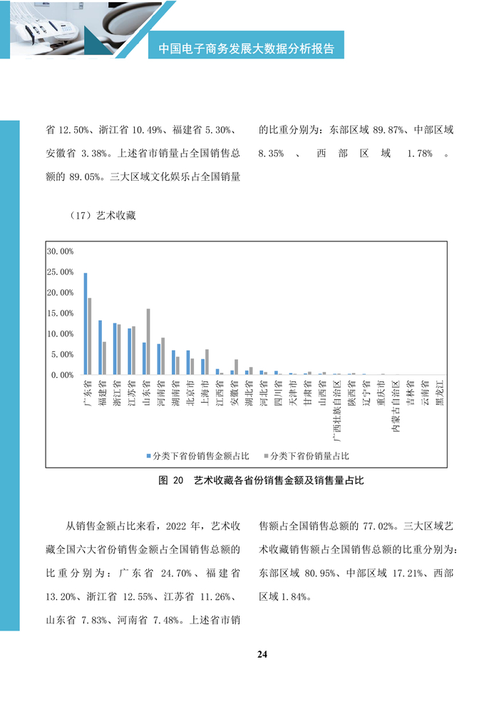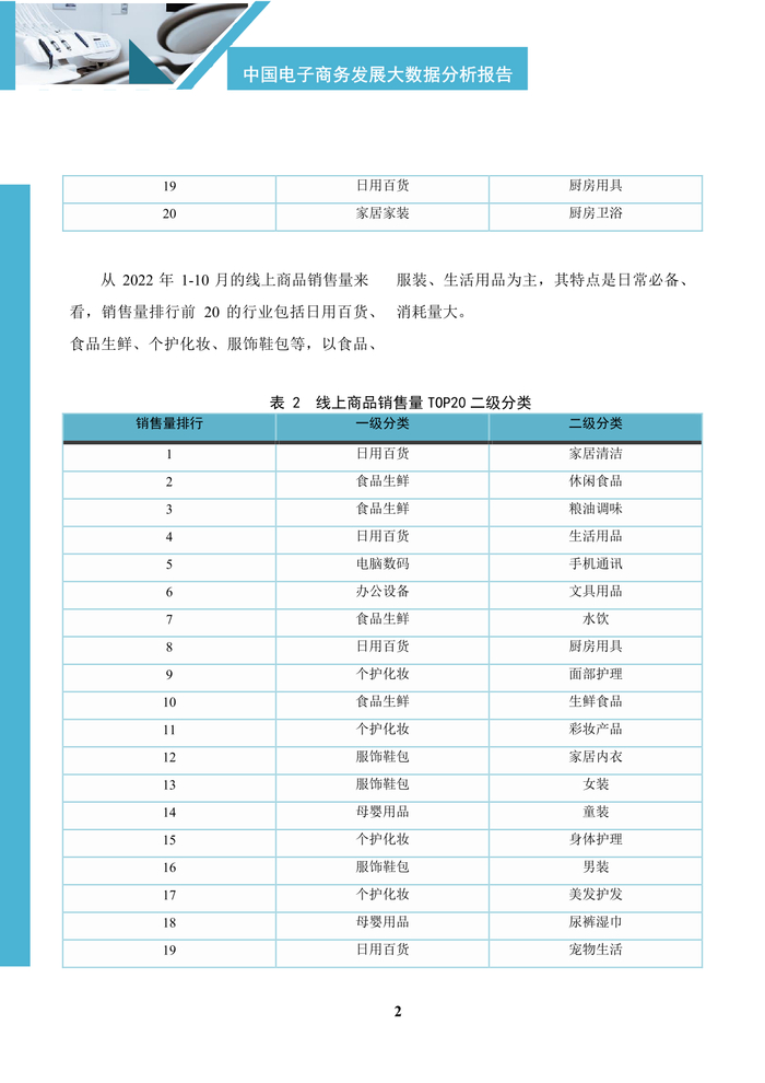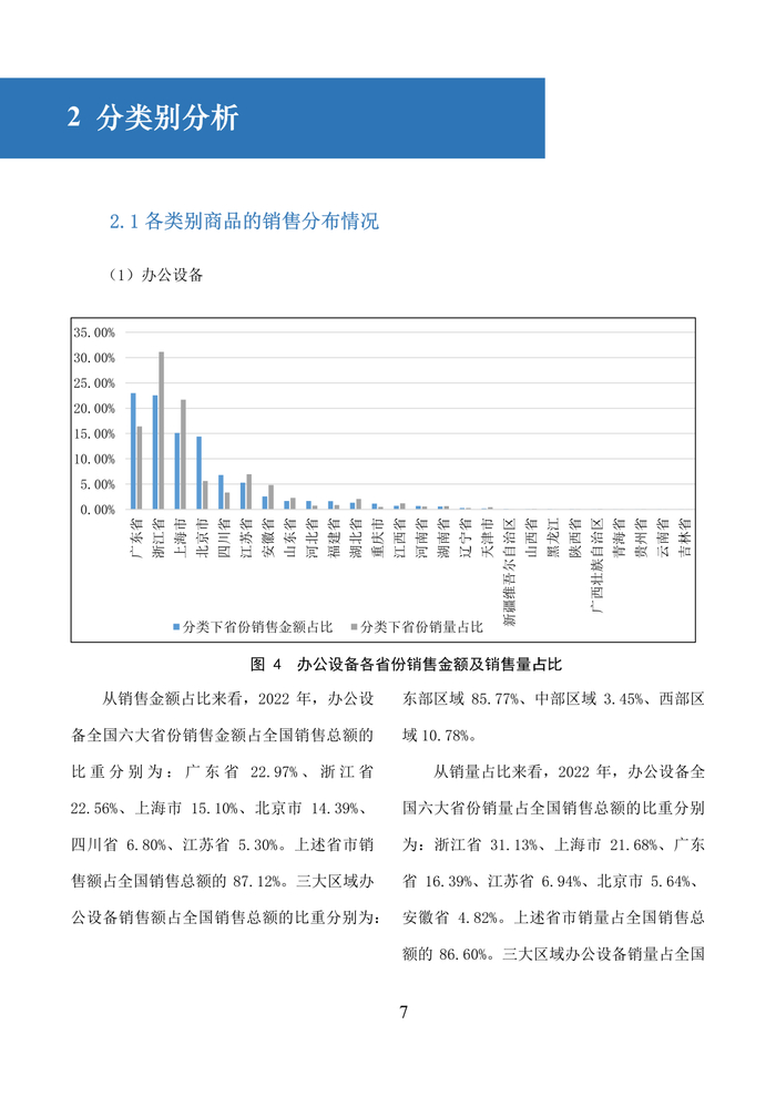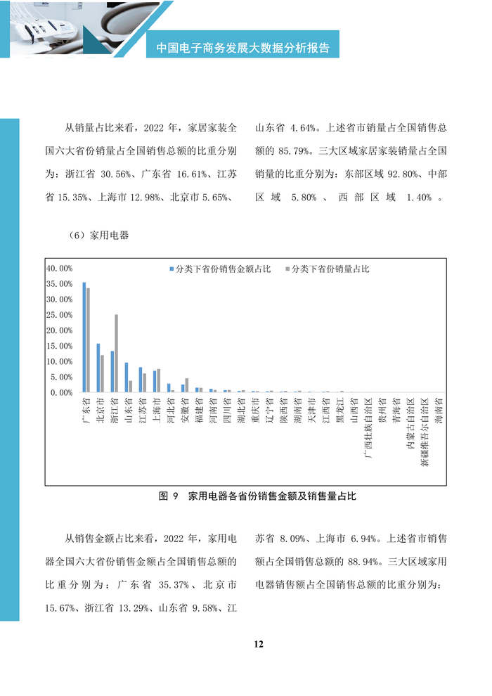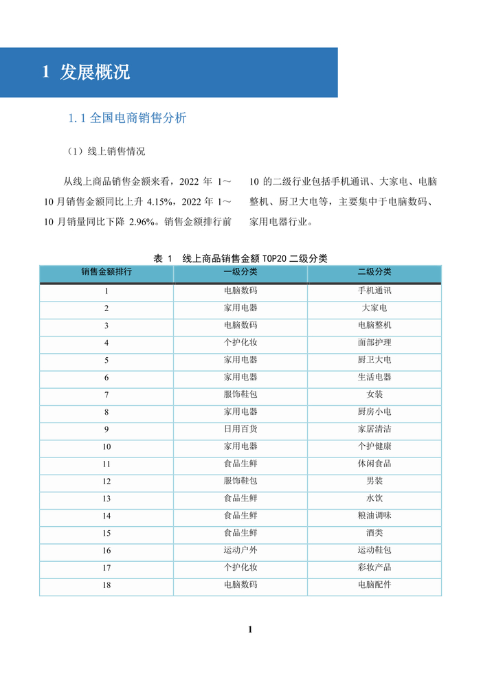 本数据分析报告的主要结论有以下几点。第一,从电商销售来看,2022年1-10月,全国电商销售金额同比上升4.15%,销量同比下降2.96%。第二,从电商消费来看,全国电商消费以家庭日常生活所需商品为主,31-40岁年龄段是消费主力军,男性群体消费更多更贵。第三,从各类商品电商销售的地理分布来看,18类商品的电商销售都具有较高的地理集聚性,其中13类商品的销售前六强省份的销售额占比(CR6)超过85%,地理集聚度最高的商品类别是金融服务类,前六大省份占比超过97%,最低的商品类别是食品生鲜类,前六大省份占比约为71%;广东、北京、上海进入了17类商品的电商销售前六强省份,浙江、江苏进入了16类商品的电商销售前六强省份。第四,从电商发展的区域格局来看,我国电商发展具有较高的空间集聚性,我国电商发展的区域格局呈现“东强西弱”态势,广东省、北京市、浙江省、上海市、江苏省、福建省是全国电商发展的第一梯队,电子商务价格指数排名前三的城市分别是上海市、杭州市和北京市。